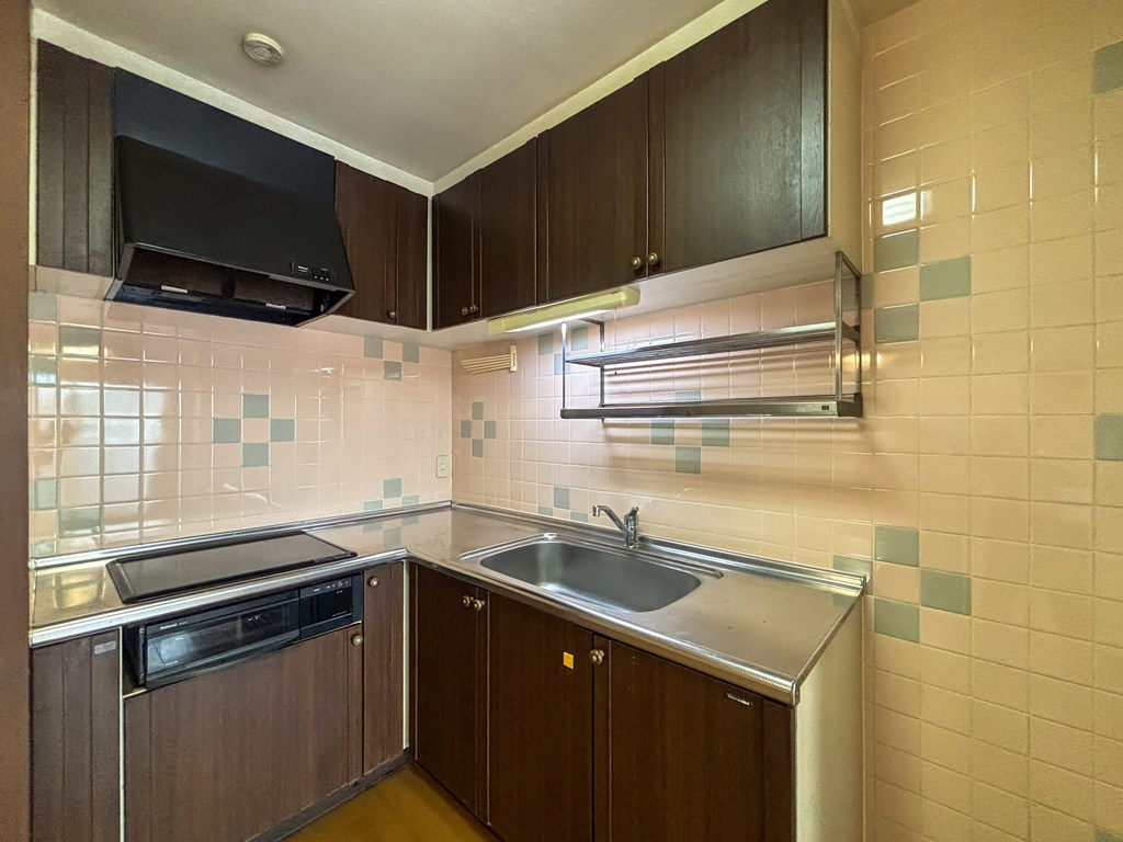 キッチンはLDKをより広く見せるL字型キッチン。吊戸付きで収納もバッチリです。