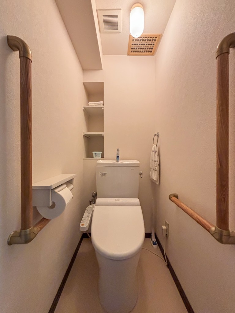 シャワートイレ。両側に手摺り、奥には小物を置ける棚もあります。