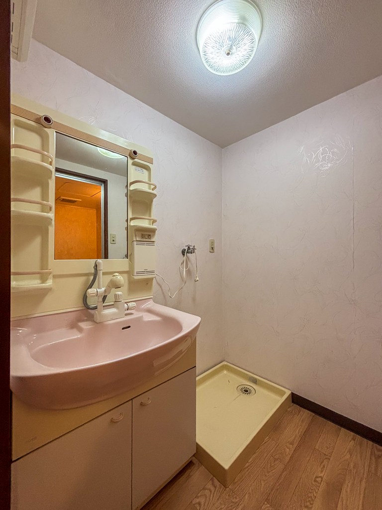コンパクトでありながらも、洗面台と洗濯機置き場を機能的に配置した洗面脱衣室。