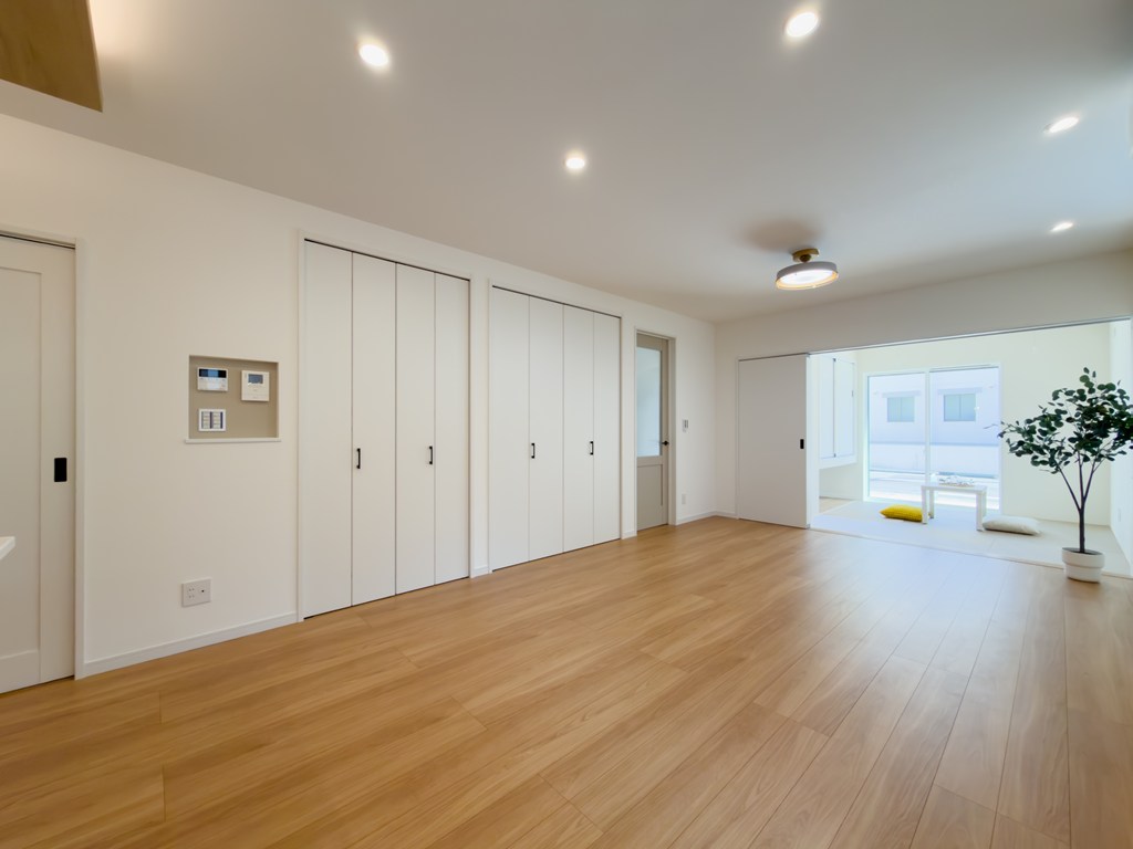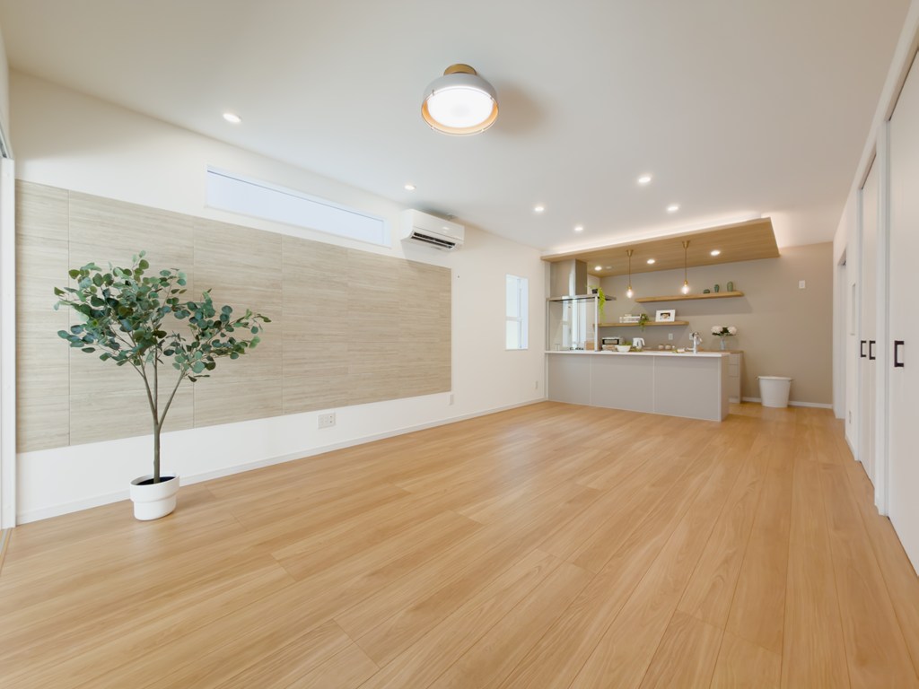リビングには用途に合わせて使い分けられる収納を3カ所設置♪日用品や雑貨、おもちゃなどをすっきりしまえて、生活感を感じさせない快適な空間に。片付けがしやすく、家族皆が自然と整えられるリビング♪