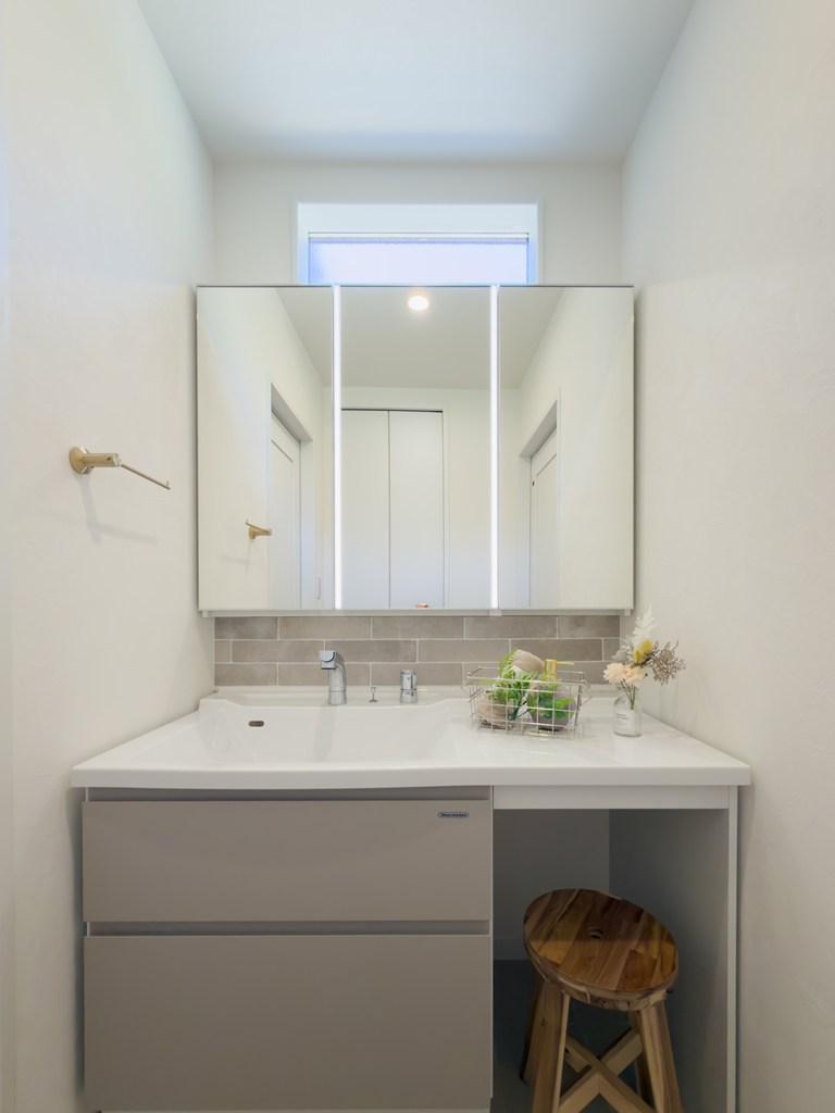 シンプル操作で使いやすいシングルレバー式シャワー水栓を採用♪三面鏡にはたっぷりの収納スペースがあり、化粧品やケア用品などがすっきり片付きます♪