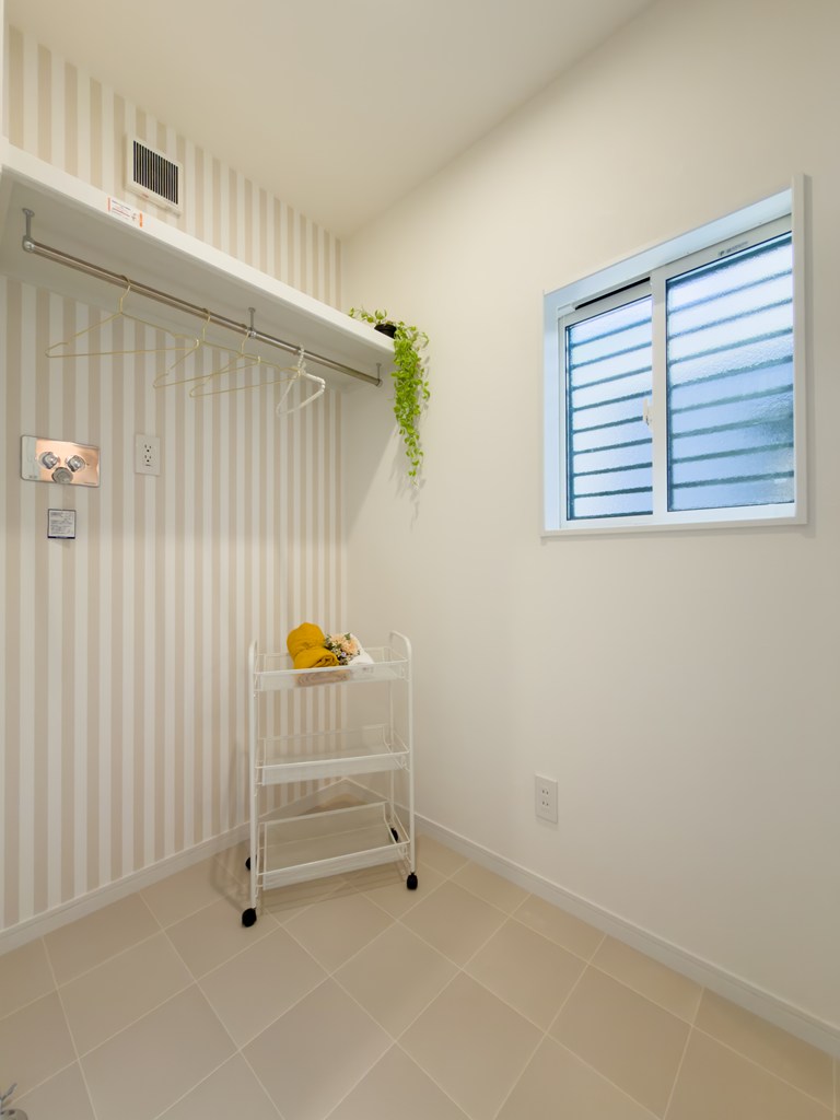 洗面所と脱衣所を分けた間取りで、家族の入浴中でも気兼ねなく洗面スペースを使える嬉しい設計。脱衣所にはハンガーパイプを備え、洗濯物の一時掛けや部屋干しにも便利です♪