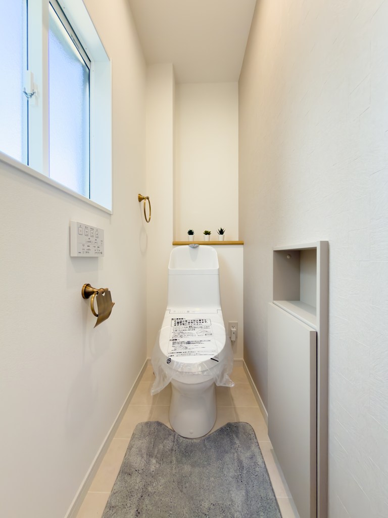 最新の温水洗浄便座付きで、快適・清潔なトイレ空間♪扉付きの収納スペースを設けており、トイレットペーパーや掃除用品などをすっきり収納可能♪