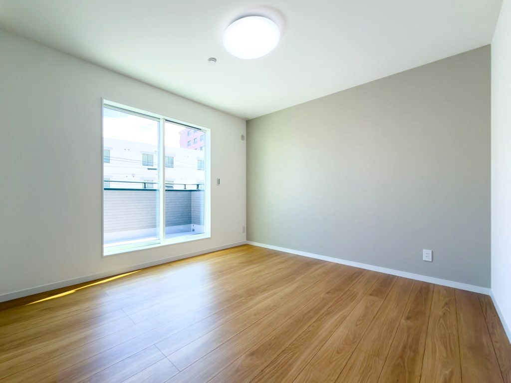 グレーのアクセントクロスが空間にほどよい落ち着きを与える主寝室♪ベッドや収納もゆったり配置できます。バルコニーにも直接出入りでき、朝の光や外の空気を気軽に感じられる心地よいお部屋です♪