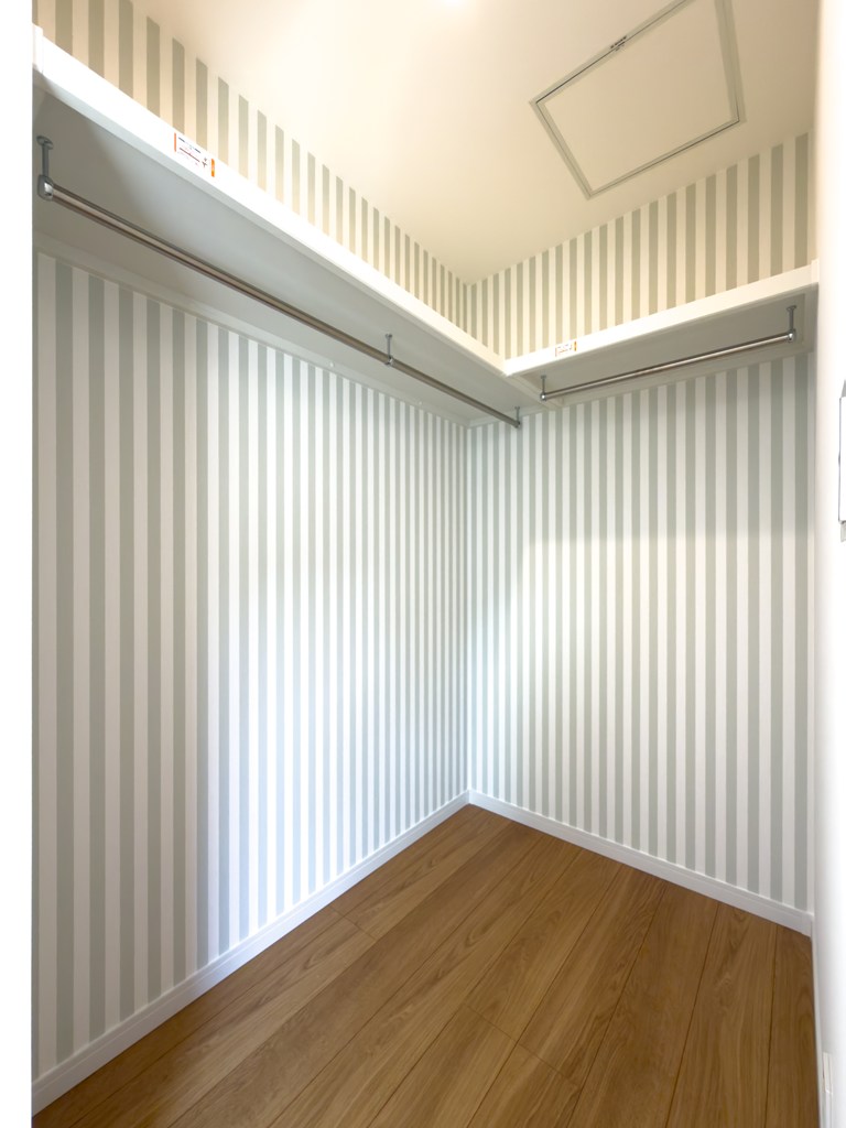 主寝室のウォークインクローゼットは、約1.5畳の広さを確保♪照明付きで中も見やすく、衣類や小物の整理がしやすい設計です♪毎日のコーディネートがスムーズになる、便利で快適な収納空間です♪