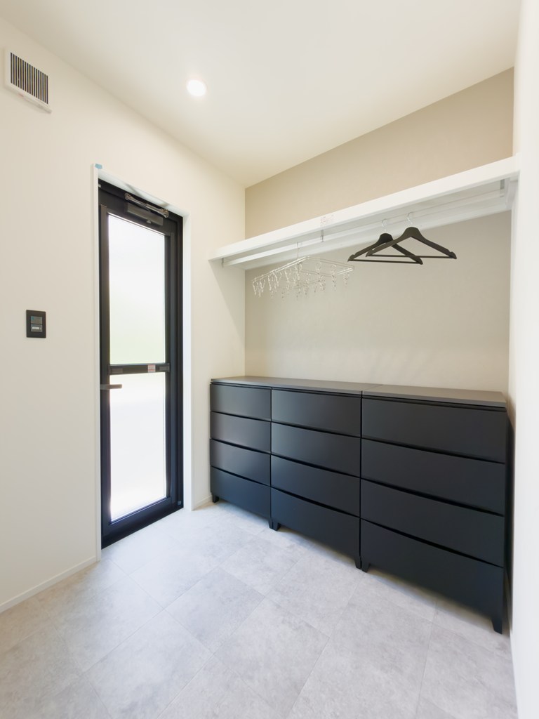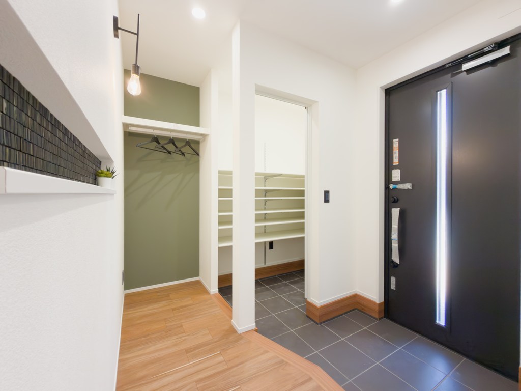 玄関には、家族全員の靴がたっぷり収納できるシューズクロークを完備♪コートやアウターを掛けられるハンガーパイプ付きで、外出・帰宅の動線もスムーズ♪