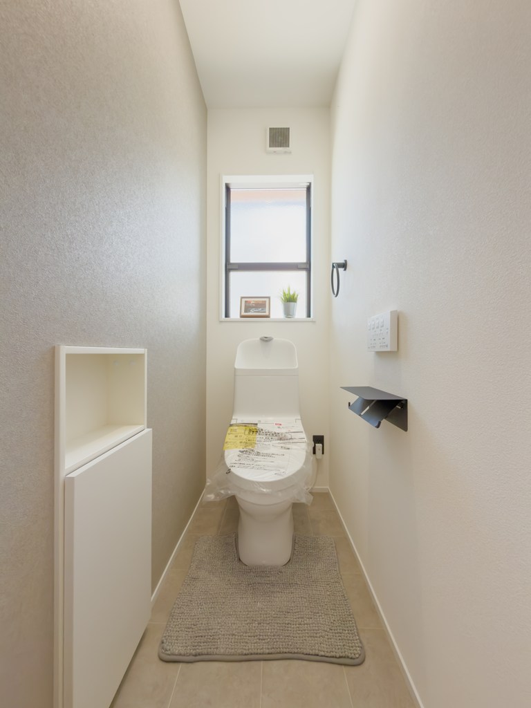 グレーのアクセントクロスが落ち着いた雰囲気を演出するトイレ。窓から差し込む自然光で明るく清潔感あふれる空間に♪扉付き戸棚もあり、収納力が高く生活感を隠してすっきり使えます♪