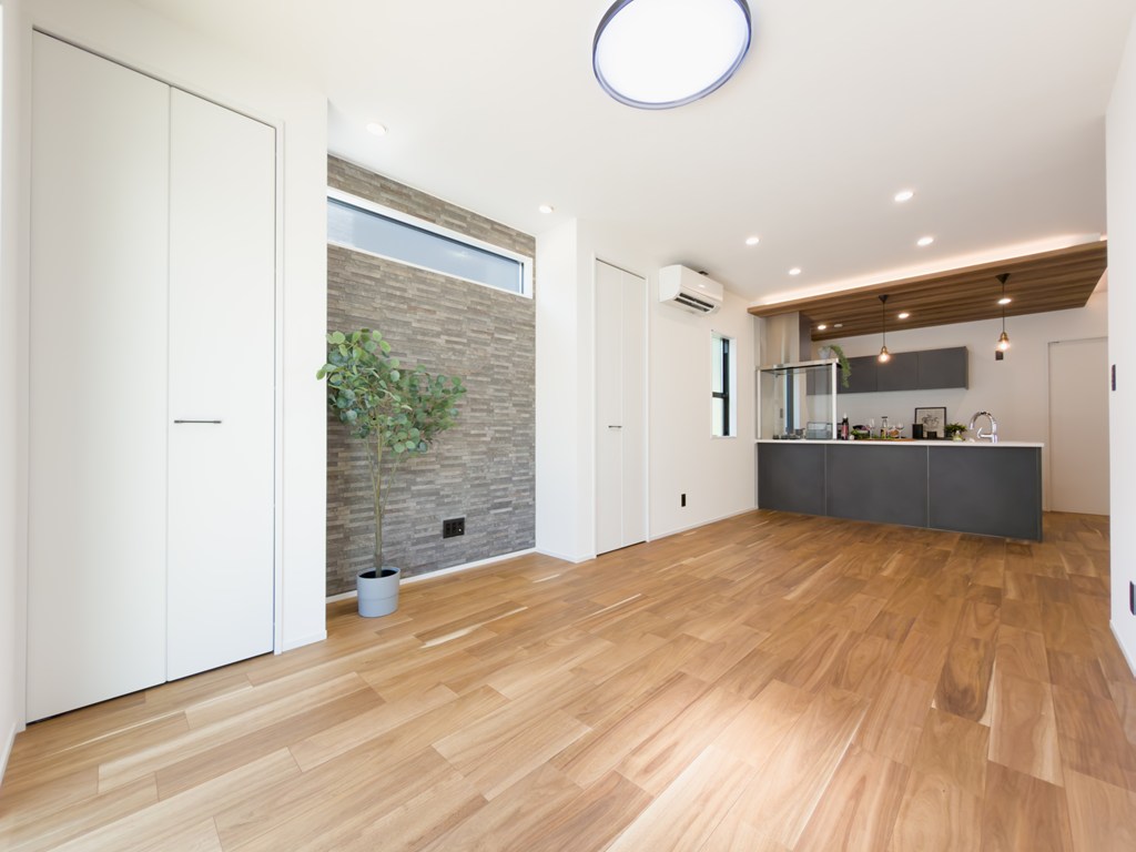 ダークグレーのエコカラットがアクセントになった18.5帖の開放的なリビング♪収納も3箇所あり、すっきりとした暮らしが叶います♪