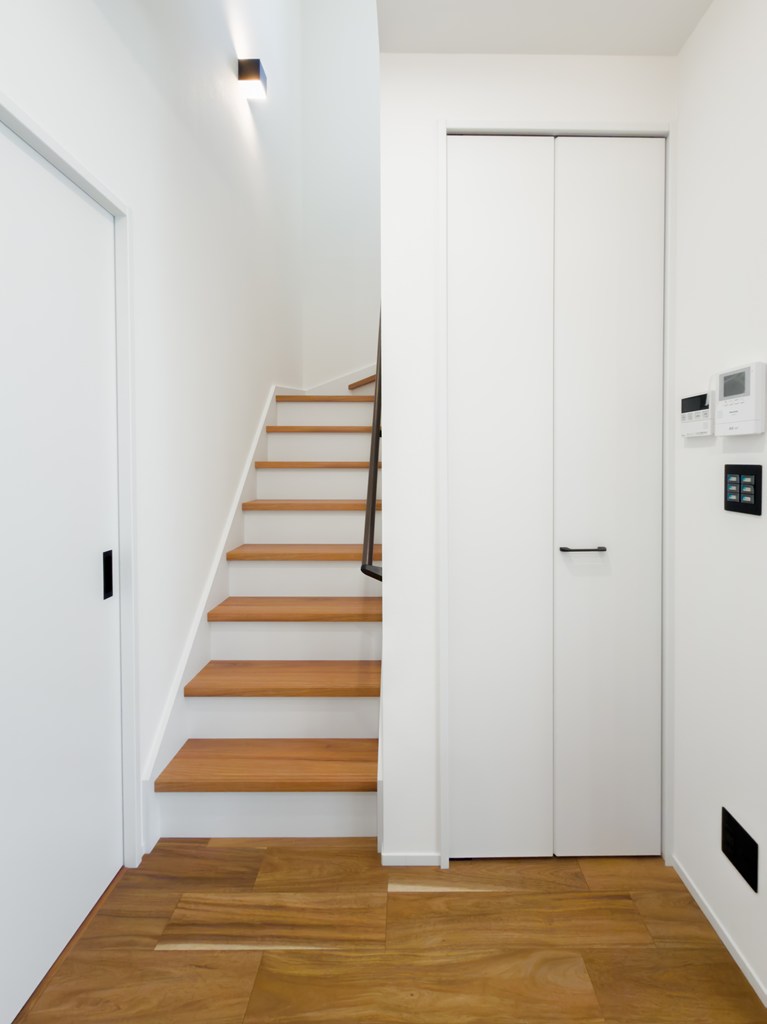 お子さまからご年配の方まで安心して使える、手すり付きの階段♪足元を優しく照らす照明も設置し、夜間の上り下りも安心です♪家族みんなが安全で快適に過ごせる工夫が詰まった設計です♪