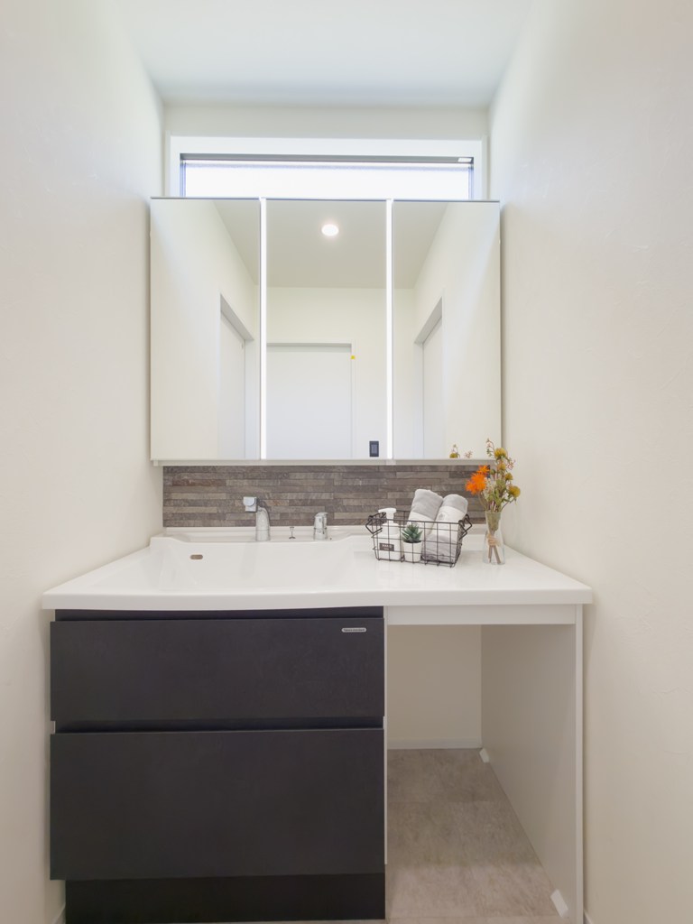 洗面所と脱衣所が独立しているため、家族が同時に使いやすく混雑を避けられます♪さらに奥にはランドリールームが直結しており、洗濯から乾燥、収納までの家事動線がスムーズで使い勝手の良いパウダールームです♪