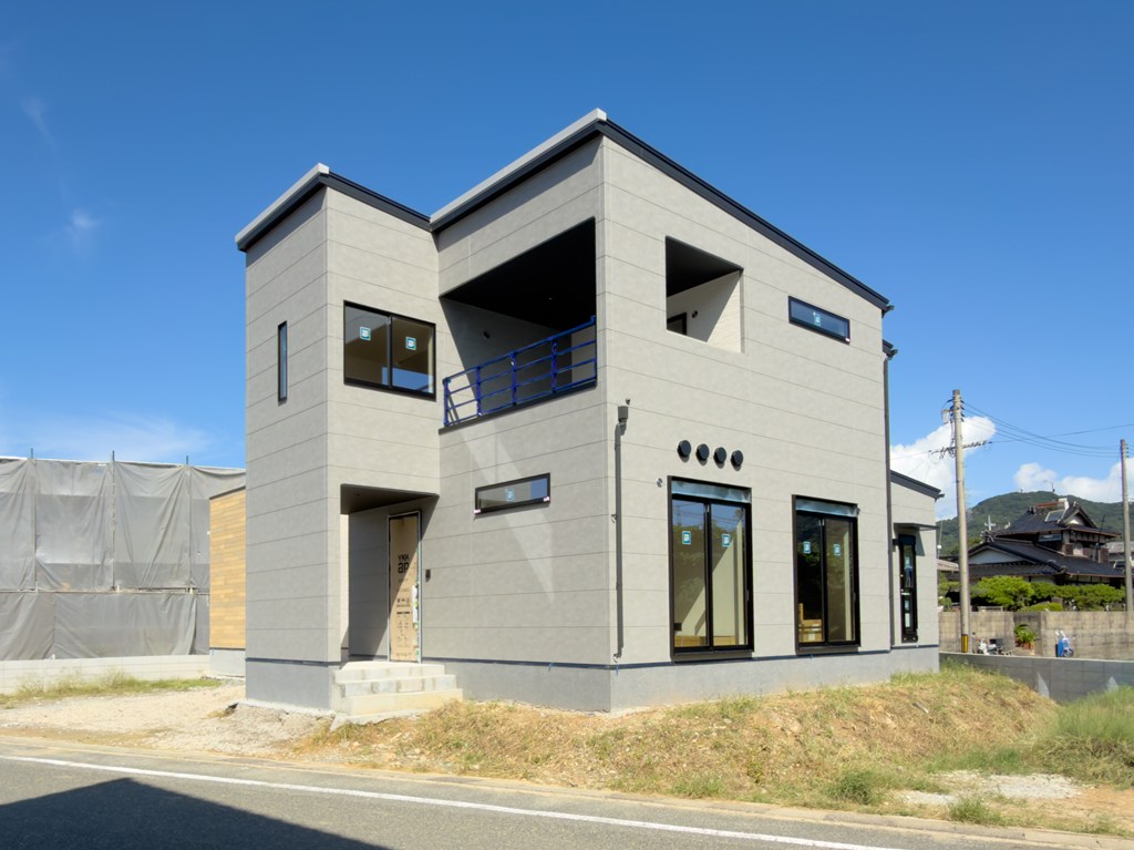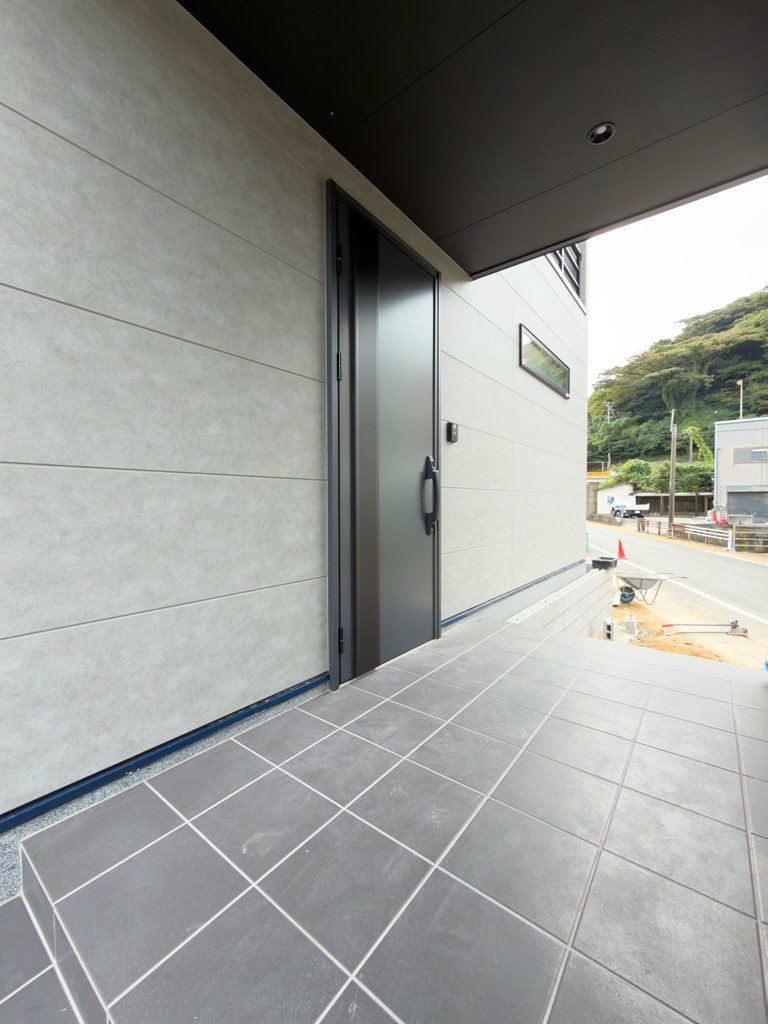 グレーの外壁色は時間とともに優しく表情を変えます♪シンプルで飽きのこないデザインは、家族の暮らしに自然に寄り添います♪インナーバルコニー付で、外から玄関が見えにくい安心のプライバシー設計です♪