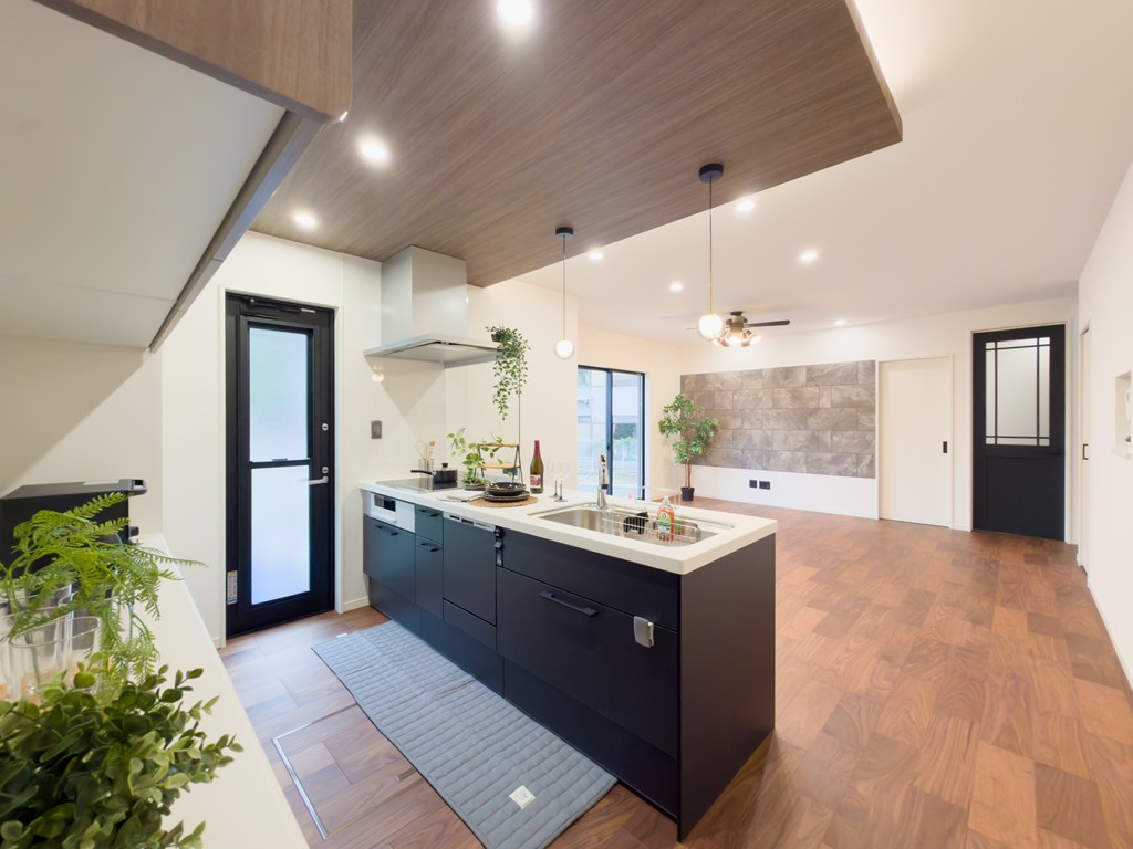 18帖の広々リビングは、家族が集まってもゆったり過ごせる開放感♪プロペラライトの優しい光が室内を明るく照らし、団らんや家事の時間も快適に♪子どもを遊ばせながら料理ができる使いやすい動線です♪