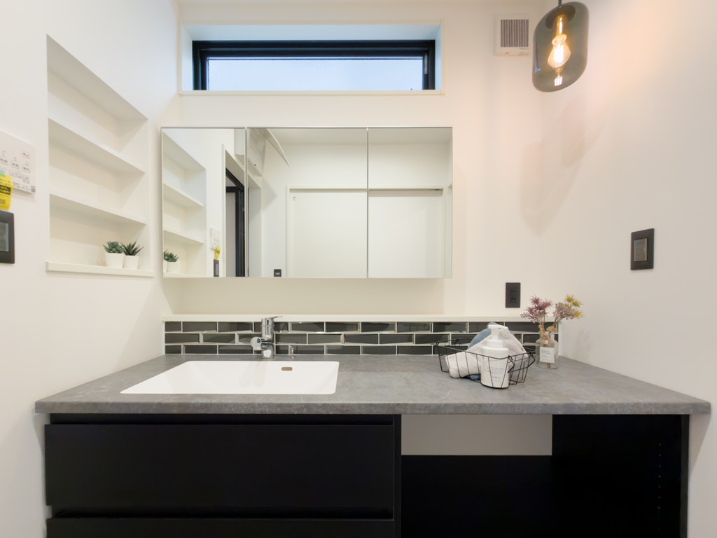 シックなグレーカウンターが落ち着いた印象の洗面化粧台♪ 広々使えて収納力も高く、側面壁に小物置きもあります♪吊り下げ照明と上部窓からの自然光で明るく快適に使え、毎日の身支度や家事がスムーズに進みます♪
