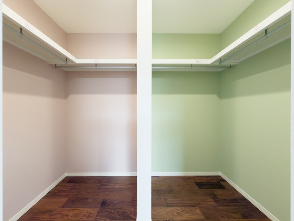 主寝室のダブルウォークインクローゼット♪ ピンクとグリーンのアクセントクロスで、奥様と旦那様で収納スペースを分けて使えます。それぞれの洋服や趣味のアイテムも整理でき、すっきり収納できる空間です♪