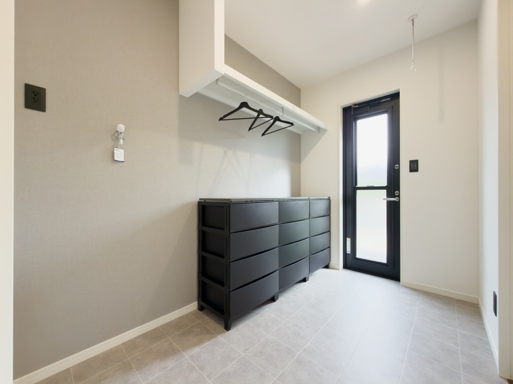 リビングと洗面所から出入りできる2way動線のランドリールームは、洗濯から干す、取り込み、畳むまで一室で完結♪ 3帖の広さに収納ボックスも完備し、家事のストレスを減らして家族の時間をゆったり楽しめます♪