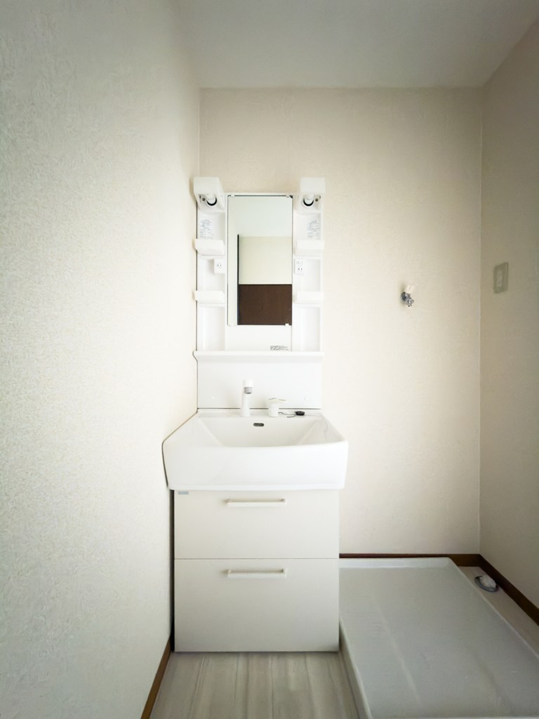 収納棚と鏡のある洗面台でゆったりと朝支度できます。