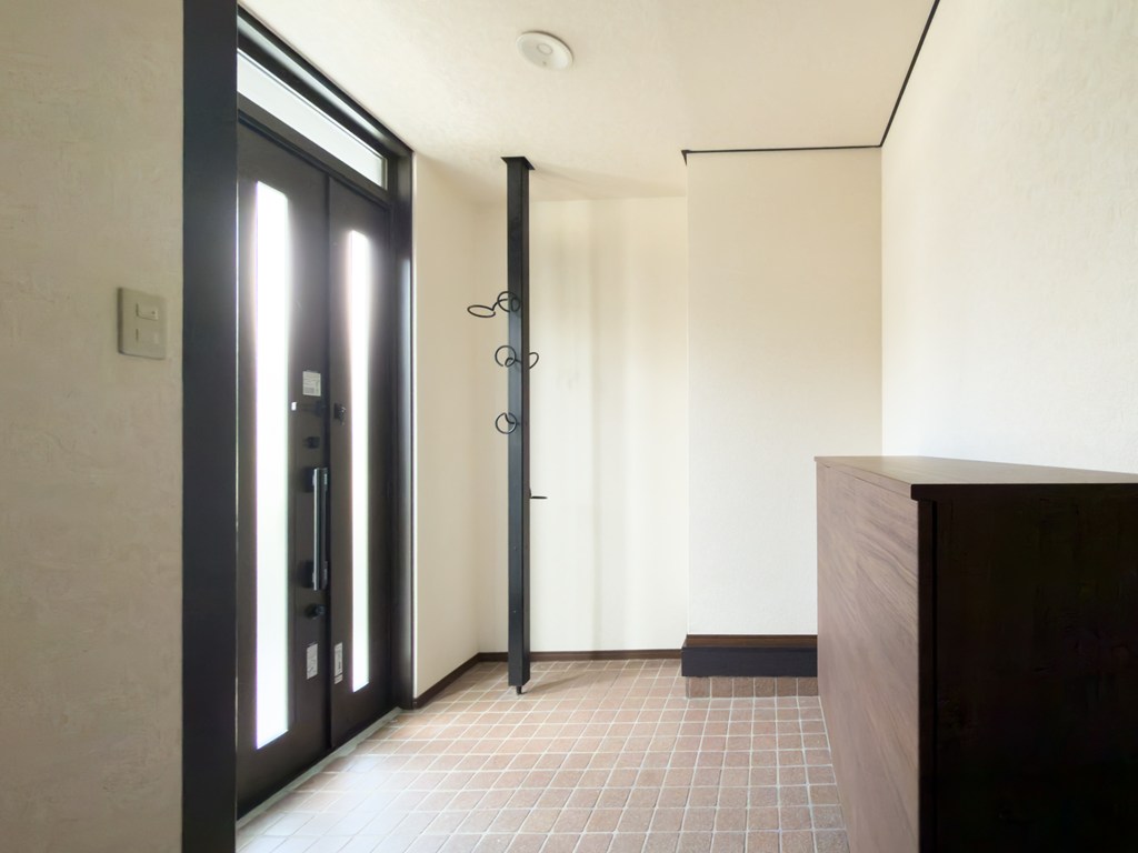 スリット窓からも光が差し込み明るい空間となった玄関で1日のオンオフを。