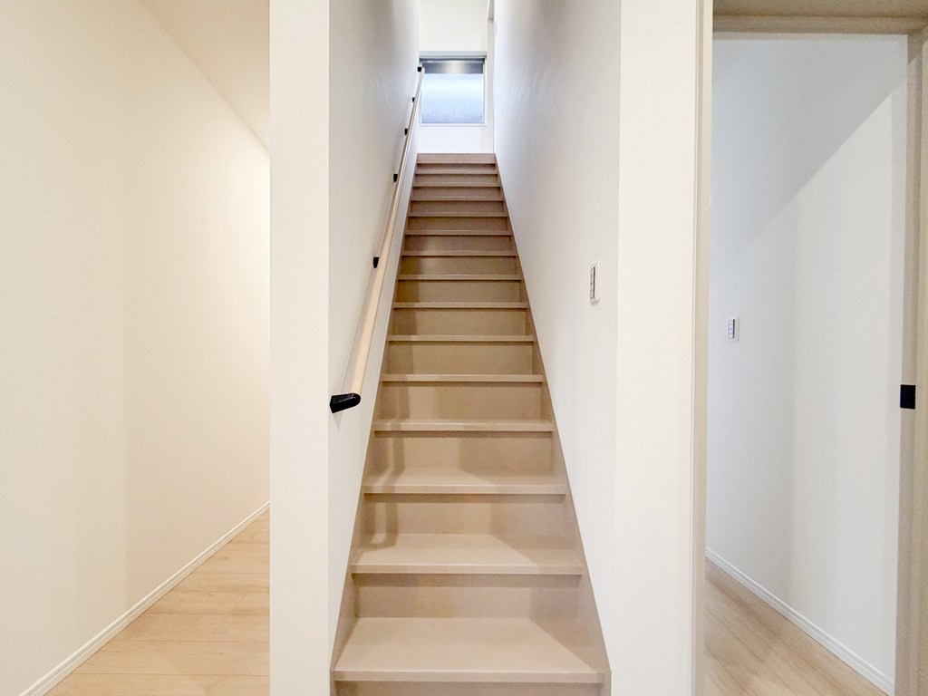2階へ上がる階段は安心設計。手摺付で、小さなお子様からご年配の方まで安全に昇り降りできる配慮がされています♪