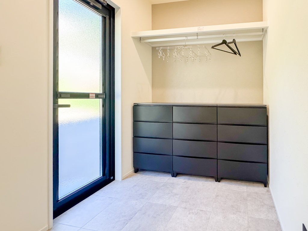 洗濯・干す・畳むの動作が一部屋で完結できるよう、ランドリールームには枕棚+ハンガーパイプ、収納を設置。忙しい奥様をしっかりサポートします。