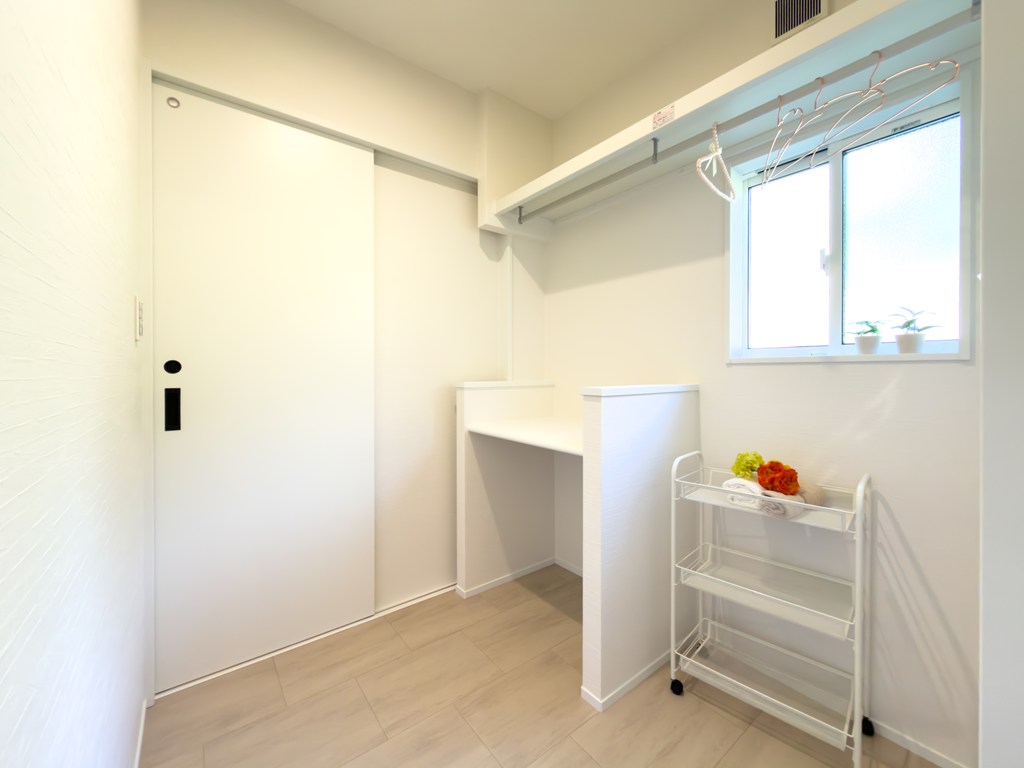 脱衣室は2畳。洗面所と分かれた間取なのでランドリールームとしても活躍!物干し金物、枕棚+ハンガーパイプ、作業台を設置。