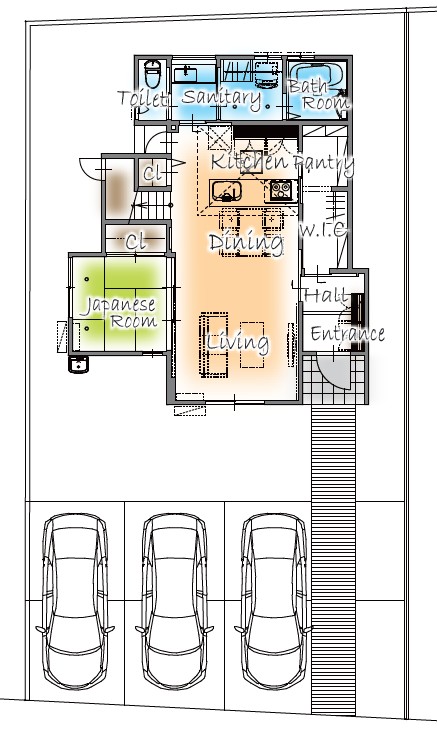 毎日の出し入れもらくちんな並列駐車。3台分の駐車スペースは急な来客にも対応できます。自転車やバイクなどを所有している方も安心です。