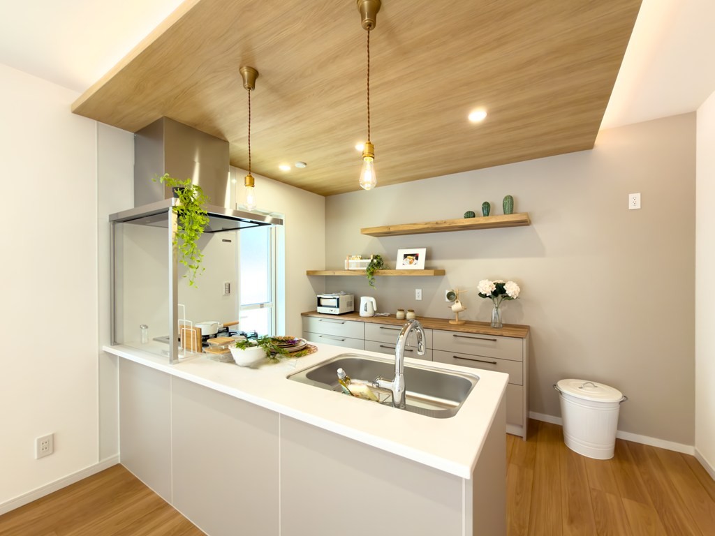 食器洗浄乾燥機、キッチンコンセント、タッチレス水栓などが完備した多機能キッチン♪家事の負担を軽減でき見た目もかわいいデザインです。背面にはカップボードを設置。食器や家電がたっぷり収納できます。
