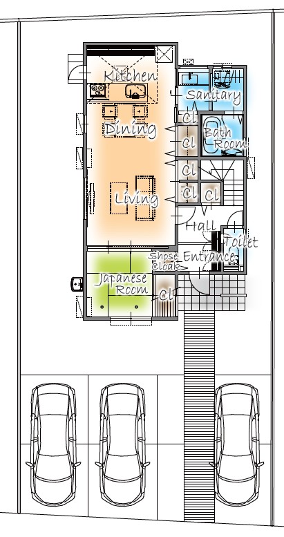 毎日の出し入れもらくちんな並列駐車。3台分の駐車スペースは急な来客にも対応できます。自転車やバイクなどを所有している方も安心です。