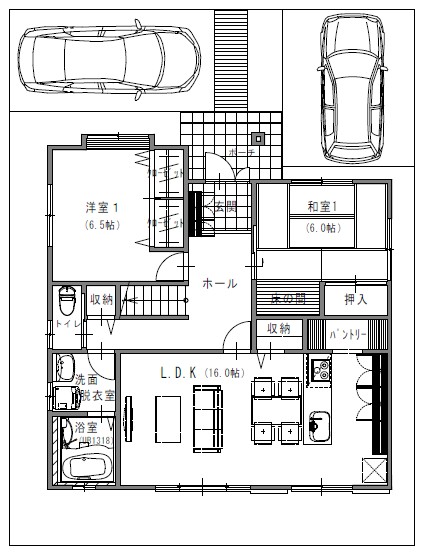 収納を多く設けた4LDKの間取り。パントリー付のリビングは広々16畳♪駐車スペース2台可能です。