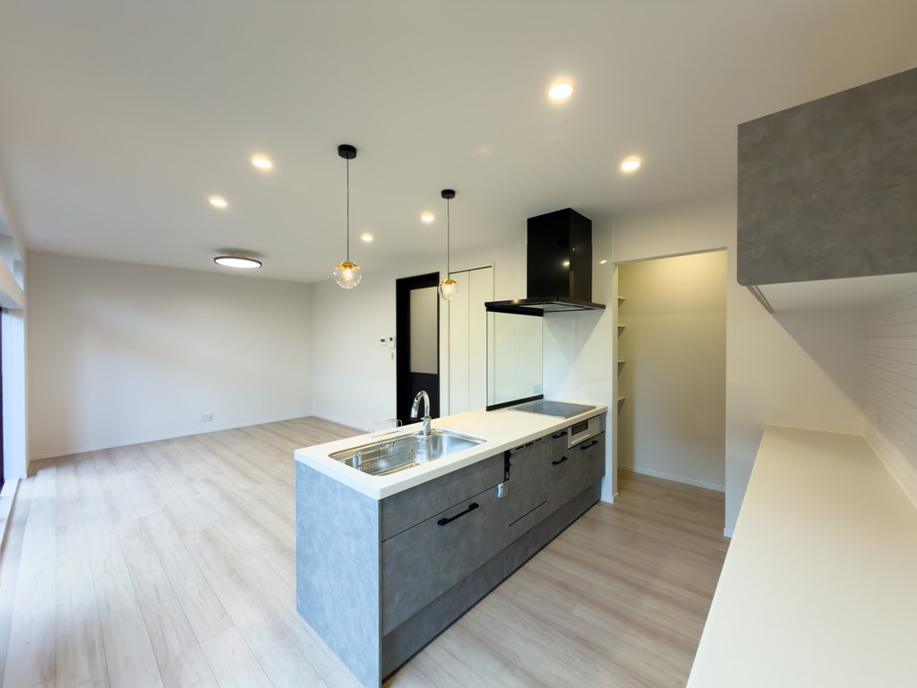 パントリー付きの16畳リビングは、家族がゆったりくつろげる空間。対面キッチンなので、家事をしながら会話も楽しめます。