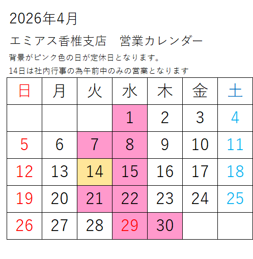 香椎支店の4月営業日のお知らせです。