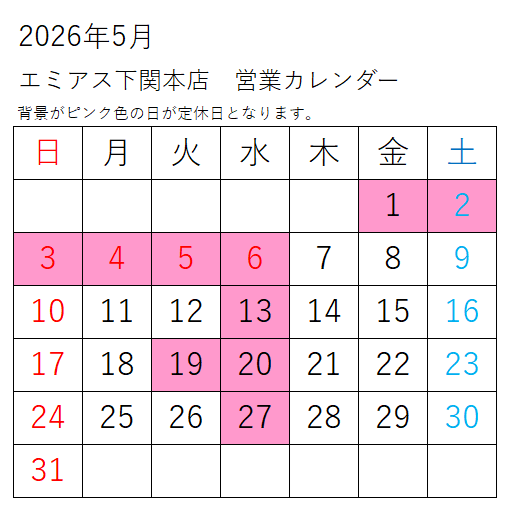 下関本店の5月営業日のお知らせです。