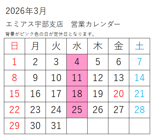 宇部支店の3月営業日のお知らせです。