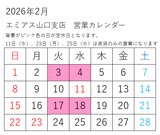 山口支店の2月営業日のお知らせです。